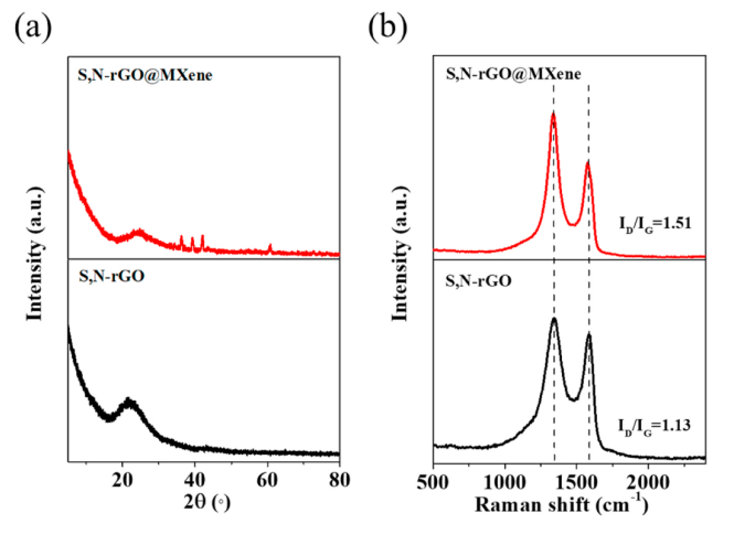 圖2. S,N-rGO@MXene和S,N-rGO的(a) XRD光譜和(b)拉曼光譜。