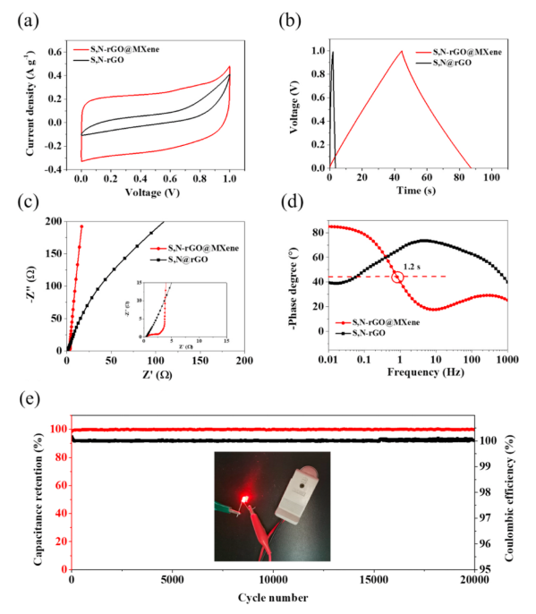 −1時(shí)的GCD曲線,(c) Nyquist曲線和高頻區(qū)放大圖,(d)基于S,N-rGO@MXene和S,N-rGO的對(duì)稱超級(jí)電容器的Bode曲線,(e)S,N-rGO@MXene超級(jí)電容器20,000次循環(huán)后的電容保持率和庫(kù)侖效率。