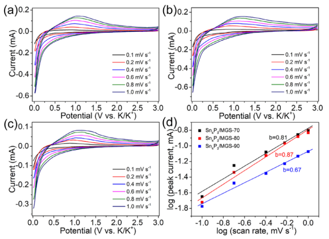 3/MGS-90陽(yáng)極在遞增的掃描速率下的CV曲線,以及(d)對(duì)應(yīng)的log(i)和log(v)曲線。