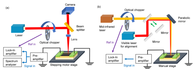 圖2. (a)探測(cè)可見(jiàn)光(690 nm)及NIR光(1310 nm和1530 nm)的測(cè)量裝置示意圖。利用步進(jìn)電機(jī)工作臺(tái)移動(dòng)樣品,改變激光光斑的位置。利用分光鏡檢測(cè)反射光,并通過(guò)攝像機(jī)調(diào)節(jié)照射位置。輸出信號(hào)由低噪聲前置放大器放大,并由鎖相放大器和頻譜分析儀測(cè)量。(b) MIR光(4.6μm)測(cè)量裝置示意圖。將可見(jiàn)光引入同一光路,調(diào)整MIR光的照射位置。輸出信號(hào)由低噪聲前置放大器放大,并由鎖相放大器測(cè)量。