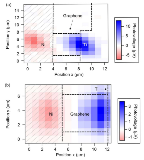 石墨烯是開發(fā)高速、寬波長(zhǎng)范圍光電探測(cè)器的理想材料。但是,由于石墨烯兩端兩個(gè)電極的每一個(gè)石墨烯/電極界面上的光電壓極性相反,它們?cè)诤暧^光照射到光電探測(cè)器時(shí)被抵消了。在本研究中,我們提出了兩種基于石墨烯的光電探測(cè)器,它們具有不同的非對(duì)稱器件結(jié)構(gòu),可以抑制兩電極界面上的光電壓抵消。其中一種光電探測(cè)器有一個(gè)局部蔭罩,只有石墨烯/電極界面的一側(cè)被金屬蔭罩遮蔽。另一種具有不同形狀的電極,通過(guò)使用梳狀電極,石墨烯/電極界面的接觸面積不同。通過(guò)掃描石墨烯光電探測(cè)器周圍的聚焦光,我們測(cè)量了光探測(cè)的位置依賴性,由于兩個(gè)光電探測(cè)器的非對(duì)稱結(jié)構(gòu),可以得到不對(duì)稱的光電電壓映射。此外,我們還證明了通過(guò)抑制光電壓抵消,光電探測(cè)器在可見(jiàn)光、近紅外光和中紅外光區(qū)域的宏觀光探測(cè)。這些非對(duì)稱結(jié)構(gòu)的石墨烯基光電探測(cè)器適用于可見(jiàn)光、近紅外光和中紅外光區(qū)域?qū)挷ǘ蔚暮暧^光電探測(cè)器。