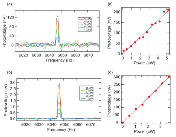 圖5. 在不同的激光功率下,用光譜分析儀測(cè)量了宏觀(a)可見(jiàn)光(690 nm)和(b)NIR光(1530 nm)光輻照下,Ni掩模石墨烯光探測(cè)器的調(diào)制光探測(cè)(6049 Hz)。用Ni掩模石墨烯光電探測(cè)器在211 Hz時(shí)的鎖相放大器測(cè)量的 (c)可見(jiàn)光(690 nm)和(d) NIR(1530 nm)的光電壓光強(qiáng)相關(guān)性。紅色的線顯示線性擬合的結(jié)果。
