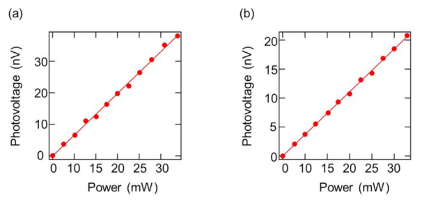 圖9. (a) Ni掩模和(b)梳狀電極的石墨烯光電探測(cè)器的宏觀MIR光電壓光強(qiáng)相關(guān)性。紅色的線顯示線性擬合的結(jié)果。