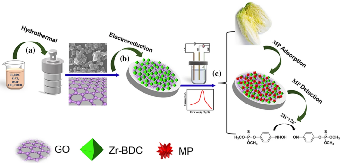 流程圖1. (a)水熱法合成Zr-BDC;(b)在GCE上通過電還原制備Zr-BDC-rGO納米復(fù)合材料;(c)的農(nóng)藥電化學(xué)傳感器的構(gòu)造和MP檢測機理。