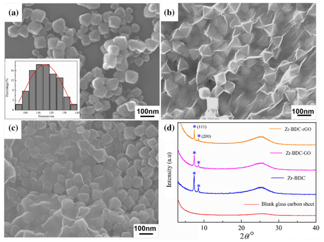 圖1. (a)Zr-BDC、(b)Zr-BDC-GO和(c)Zr-BDC-rGO納米復(fù)合材料的FE-SEM圖像。Zr-BDC的粒徑分布(插圖A);(d)空白玻璃碳薄片、Zr-BDC、Zr-BDC-GO和Zr-BDC-rGO納米復(fù)合材料的XRD譜圖。