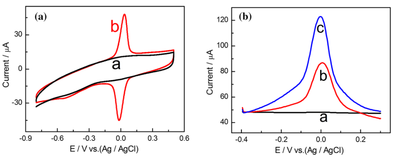 -1 MP在0.1 M PBS溶液(pH = 5.5)中富集(a)前(b)后Zr-BDC-rGO/GCE的CV曲線,掃描速率為100 mV s