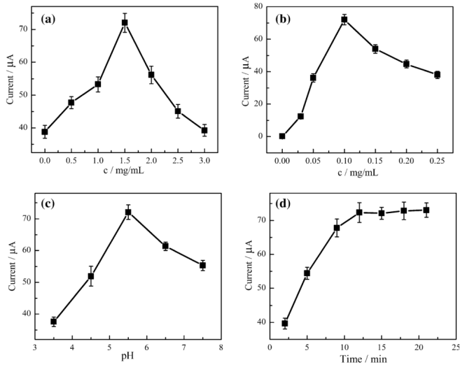圖4. (a)滴液中的Zr-BDC濃度,(b)滴液中的石墨烯濃度,(c)電解液中的pH值,(d) MP富集時間對MP檢測性能的影響。