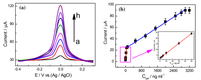 圖5. (a)在含有不同MP濃度的0.1 M PBS中Zr-BDC-rGO/GCE的SWV曲線: 10, 100, 500, 1000, 1500, 2000, 2500 and 3000 ng mL