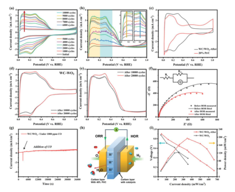 Figure 3. (a) CV曲線。 (b)在1600 rpm轉(zhuǎn)速下的LSV曲線。(c) WC/WO2-After-10和商業(yè)20 wt% Pt/C的CV曲線。(d)WC/WO2-After-10循環(huán)10 000次前后的CV曲線和(e)相應的LSV曲線。(f)原始WC/WO2和WC/WO2-After-10的交流阻抗曲線。(g)CO耐受性評估。(h)質(zhì)子交換膜燃料電池(PEMFC)的主要結(jié)構(gòu)示意圖。(i)功率密度和i-V曲線。