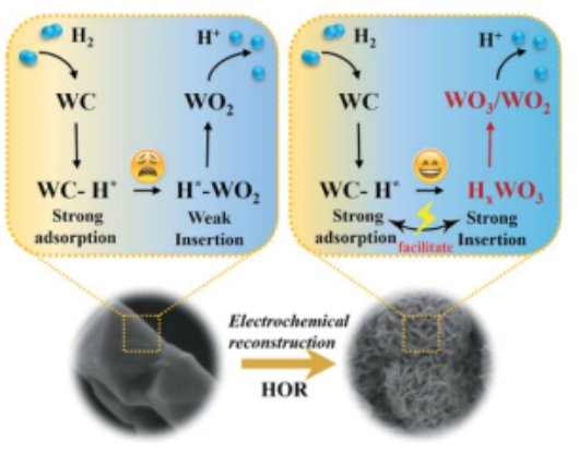 Figure 4. 原位電化學重構(gòu)的WC/WO2–WO3的示意圖,以及提高HOR性能的相應機制。