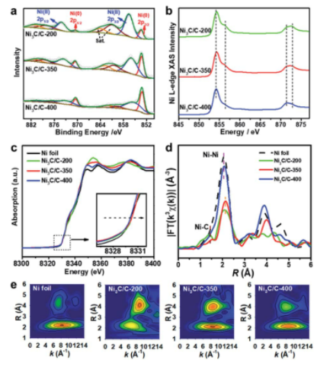Figure 2. (a) XPS譜圖。(b)Ni L-邊TEY XAS光譜。(c) Ni K-邊XANES光譜,插圖是圓圈區(qū)域的放大圖像。(d) EXAFS光譜。(e)小波變換。