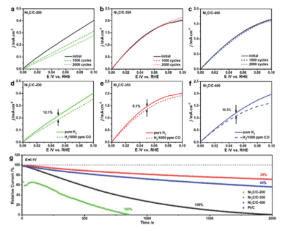 Figure 4. (a) Ni3C/C-200, (b) Ni3C/C-350 和 (c) Ni3C/C-400的加速耐久性試驗(yàn)結(jié)果。(d-f) 1000 ppm CO存在下,三種催化的極化曲線比較。(g) 在0.05 V電位下存在1000 ppm CO時(shí),相對(duì)電流-時(shí)間計(jì)時(shí)電流響應(yīng)。