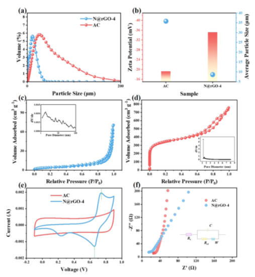 Figure 3.AC和N@rGO-4 (a)的粒度分布;ζ-AC和N@rGO-4 (b)的電位和平均粒徑,N@rGO-4 (c)和AC (d)的N2吸附/解吸等溫線和孔徑分布,AC和N@rGO-4 (e)的CV曲線,以及AC和N@rGO-4 (f)的EIS圖。圖(f)的插圖是相應的等效電路。