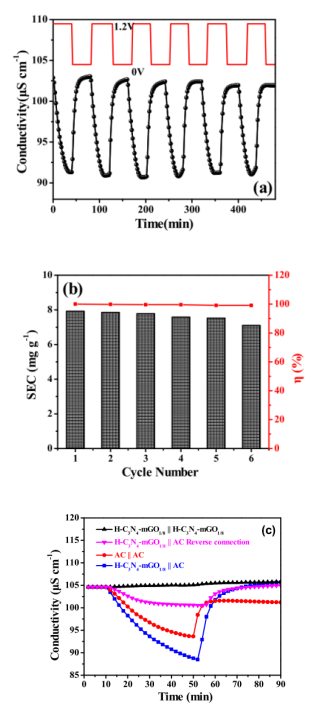 -1 NaCl溶液中1.2 V時(shí)的循環(huán)CDI實(shí)驗(yàn);(b)相應(yīng)的柱狀圖;(c)AC||AC、H-C
