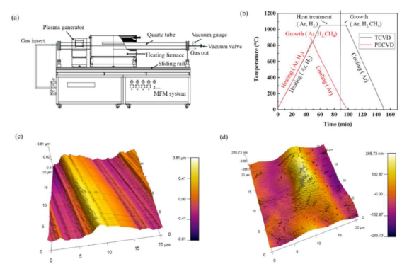 圖1. (a)PECVD器件原理圖,(b)PECVD和TCVD生長過程示意圖,(c)未預處理的銅和(d)電化學拋光銅的三維形貌AFM圖像。
