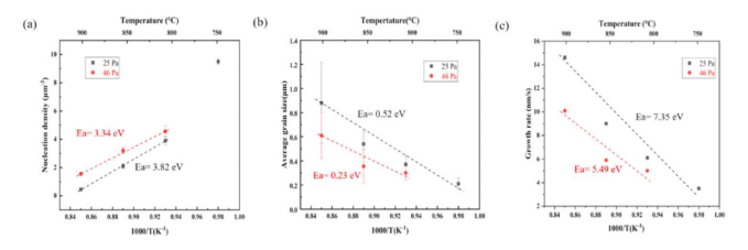 圖11. PECVD法生長的石墨烯的(a)形核密度、(b)晶粒尺寸和(c)生長速率的Alrhenius圖。(黑色和紅色符號分別代表壓力為25Pa和46 Pa)。