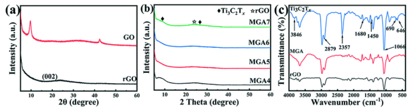 Figure 1. (a) GO 和 rGO 的 XRD 圖譜,(b) MGAX 的 XRD 圖譜,和 (c) MGA6、Ti