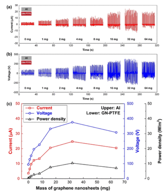 Figure 5. 基于鋁箔和 GN-PTFE 薄膜的 TENG 的輸出摩擦電性能,石墨烯納米片的質(zhì)量變化范圍為 0 至 64 mg。 (a) 輸出短路電流。 (b) 輸出開路電壓。 (c) 最大短路電流、開路電壓和功率密度。