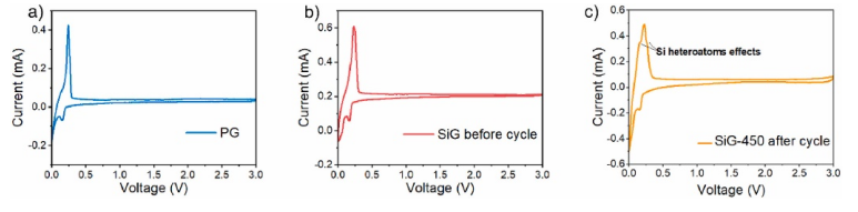 Figure 4. (a) PG 和 (b) 循環(huán)前的 SiG-450 和 (c) 循環(huán)后的 SiG-450 的 CV曲線,掃描速率為 0.1 mV s