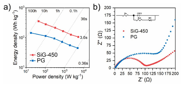 硅/碳復(fù)合材料被發(fā)現(xiàn)是一種防止電池循環(huán)過程中硅材料變質(zhì)的流行策略。在此,通過簡(jiǎn)便的合成路線報(bào)道了一種新型的硅摻雜石墨烯材料(SiG),并研究了其在鋰離子電池中的應(yīng)用。微波輻照處理成功地實(shí)現(xiàn)了硅雜原子摻雜到石墨烯晶格中,從而使原始石墨烯的比容量增加了一倍。更重要的是,SiG 表現(xiàn)出循環(huán)后鋰離子存儲(chǔ)和擴(kuò)散的改善,以及能量密度和功率密度的提高,這歸因于分散在表面上的 Si 雜原子和更有序的石墨烯晶格。用 SiG/LiFePO