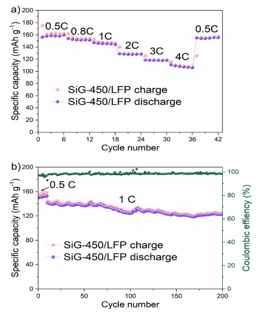 Figure 7. SiG-450/LFP全電池的倍率性能和循環(huán)性能。