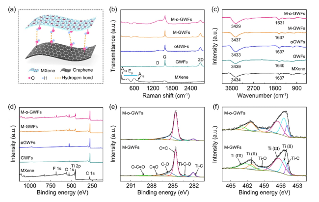 圖2 (a)羥基化石墨烯與MXene官能團(tuán)反應(yīng)形成MXene與GWFs之間的氫鍵界面。(b) Raman, (c) FTIR, (d) XPS測量,高分辨率(e) C 1s和(f) Ti 2p XPS光譜。