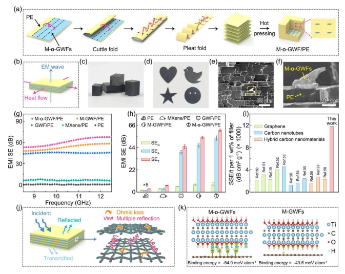圖3. (a) M-o-GWF/PE復(fù)合材料的制備方法。(b)說明電磁干擾SE和熱導(dǎo)率測量的首選方向的示意圖。(c, d)復(fù)合材料照片和(e, f) SEM圖像。(g) EMI SE和(h)各種樣品對應(yīng)的SER、SEA和SET。(i)納米碳填充聚烯烴復(fù)合材料及其雜化材料之間的SSE/t / 1wt %填料的比較。(j)復(fù)合材料的EMI屏蔽機理,(k)計算M-o-GWFs和M-GWFs的電荷密度差。