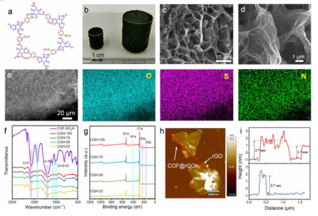 3H 的化學結(jié)構(gòu)。 (b) 分別使用 20 mL(左)和 120 mL(右)高壓釜合成的 CGH-50 的照片。 (c, d) CGH-50 的 SEM 圖像。 (e) CGH-50 的 SEM 圖像和相應的 EDS 映射。 (f) COF-SO