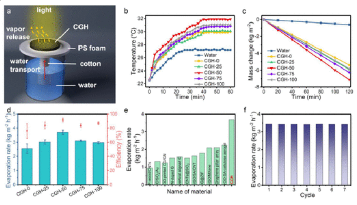 -2)下隨時間變化的溫度和質(zhì)量變化。 (d) 來自 CGH 的水分蒸發(fā)率和 1 個太陽下的能源效率。誤差條代表使用不同樣品的五次測量獲得的標準偏差。 (e) 蒸發(fā)速率比較顯示 CGH-50 在碳基蒸發(fā)器中的高性能。 (f) 使用模擬海水和 CGH-50 進行七個循環(huán)的穩(wěn)定性測試。