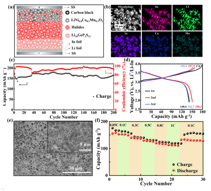 6-3在室溫下的電化學性能:(c) 0.1 C 下的循環(huán)性能(前兩個圓圈在 0.05 C 下激活電池)。(d) 200 個循環(huán)中前三個循環(huán)的恒電流充放電電壓曲線。(e) ASSLMB 中復(fù)合陰極顆粒在 200 次循環(huán)后的表面微觀形貌。(f) 在 0.05 C、0.1 C、0.3 C、0.5 C、0.8 C 和 1 C 時的倍率性能。
