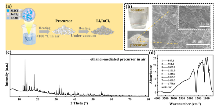 圖 1. (a) 本工作中乙醇介導(dǎo)的鹵化物電解質(zhì)合成路線示意圖。 (b) 透明溶液和獲得的前體的光學圖像,前體粉末的 SEM 微觀形貌。 (c) 乙醇介導(dǎo)的前體的 XRD 圖譜。 (d) 乙醇介導(dǎo)前體的 FTIR 光譜。