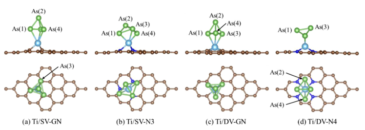 4在不同碳基單原子Ti/V/Cr/Mn吸附劑(氮原子摻雜、單空位和雙空位)表面的吸附特性。分析了單原子吸附劑的幾何形狀、吸附構(gòu)型、吸附能、電子結(jié)構(gòu)、電子密度等數(shù)據(jù)。通過(guò)對(duì)比分析16種吸附劑的計(jì)算結(jié)果,發(fā)現(xiàn)雙缺氮摻雜基底的催化劑具有較高的穩(wěn)定性。通過(guò)對(duì)電荷轉(zhuǎn)移和態(tài)密度的分析,發(fā)現(xiàn)單原子吸附劑催化劑對(duì)As