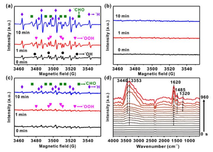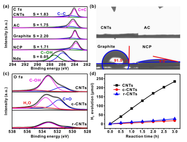 圖2 (a)各種碳材料的c1s XPS。(b)各種碳材料的接觸角分析。(c) O 1s CNTs、c-CNTs和r-CNTs的XPS。(d) CNTs、c-CNTs和r-CNTs催化HCHO脫氫過(guò)程中隨時(shí)間產(chǎn)生的氫。