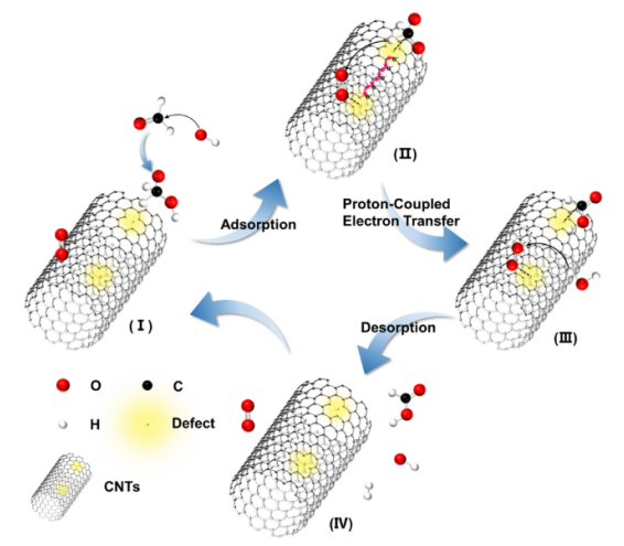 圖3. (a)連續(xù)5個(gè)反應(yīng)循環(huán)中,碳納米管的H2產(chǎn)率和碳納米管的缺陷程度(通過(guò)拉曼光譜的ID/IG表征)。在每個(gè)循環(huán)中,反應(yīng)物為HCHO濃度為¼0.5 mol L × 1的水溶液,NaOH濃度為¼1.0 mol L × 1的水溶液。(b)循環(huán)x后CNTs的拉曼光譜(表示CNT-x)。碳納米管樣品(c)反應(yīng)前和(d)反應(yīng)5個(gè)循環(huán)后的TEM圖像。(c)和(d)的插圖顯示了相應(yīng)樣品的SEM圖像。(e,f)反應(yīng)前和反應(yīng)5個(gè)循環(huán)后的HRTEM圖像。