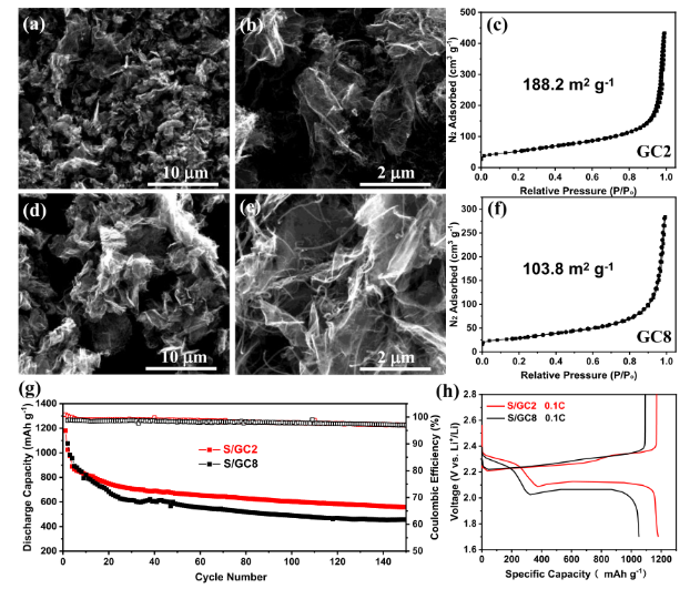 2吸附/脫附等溫線。(g) 電流速率為0.2C時(shí)的循環(huán)性能,和(h)電流速率為0.1C,含硫3mg cm