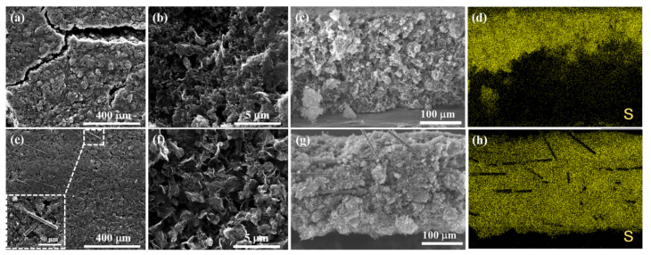 圖4. 循環(huán)100次后,得到(a, b) S/GC2和(e, f) CFs-S/GC2陰極俯視圖的SEM圖像。(c, d) S/GC2陰極和(g, h) CFs-S/GC2陰極對(duì)應(yīng)S元素映射的截面圖。