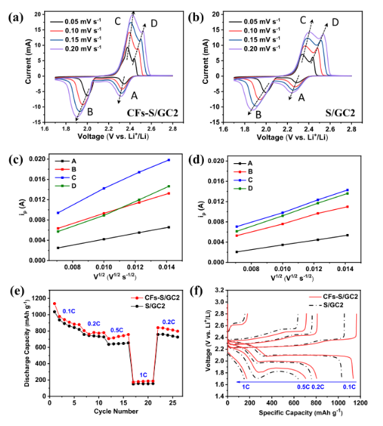 -l時(shí)的CV曲線。以及(c) CFs-S/GC2和(d) S/GC2陰極的掃描速率v