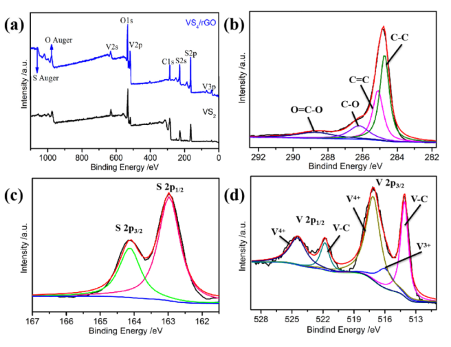 4的(b) C 1s、(c) S 2p和(d) V 2p核級及對應(yīng)的退卷積光譜。