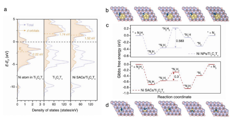 相關(guān)科研成果由中國科學(xué)院理化技術(shù)研究所Tierui Zhang等人于2022年發(fā)表在Advanced Matreials (doi: 10.1002/adma.20220438)上。原文Vacancy-rich MXene-immobilized Ni single atom as high-performance electrocatalyst for hydrazine oxidation reaction。