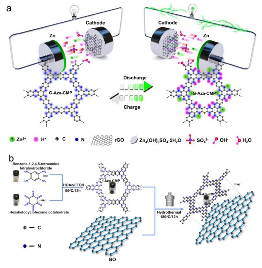 由于聚合物的穩(wěn)定結(jié)構(gòu),使用聚合物正極材料的可充電水系鋅離子電池(AZIBs)通常表現(xiàn)出優(yōu)異的循環(huán)穩(wěn)定性。然而,它們的進(jìn)一步發(fā)展受到相對較低的產(chǎn)能的限制。在此,本工作主要設(shè)計(jì)了在二維方向上具有豐富的亞氨基活性位點(diǎn)的石墨烯-共軛微孔聚合物復(fù)合材料G-Aza-CMP,,具有超高理論容量 (602 mAh g