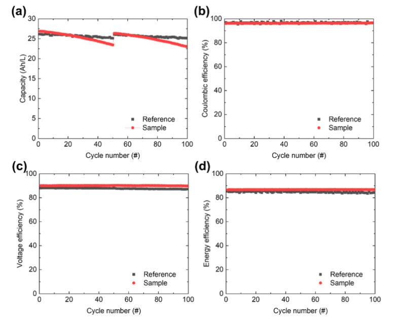 2) 下的 VRFB 電池性能:(a) 容量,(b) CE,(c) VE,和 (d) EE,100 次循環(huán)。
