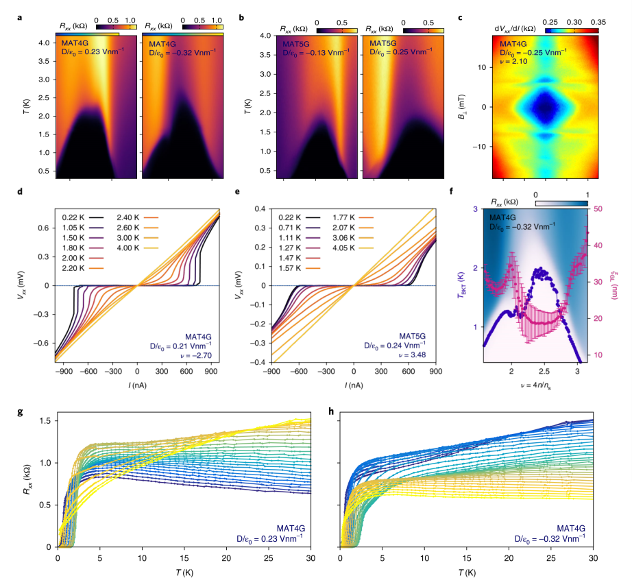 ε0 = 0.23 V nm-1 ) (N = 2, 3, 4, 5),顯示所有四個(gè)系統(tǒng)在各自魔角處的超導(dǎo)躍遷。它們的扭轉(zhuǎn)角對(duì)應(yīng)于 1d-g 中用于計(jì)算的相同值,這些值也在 1c 中表示。 MAT4G 和 MAT5G 的常態(tài)電阻率小于 MATBG 和 MATTG,可能是由于存在額外的色散帶。 MAT4G 和 MAT5G 顯示的數(shù)據(jù)分別來(lái)自設(shè)備 4B 和設(shè)備 5A。
