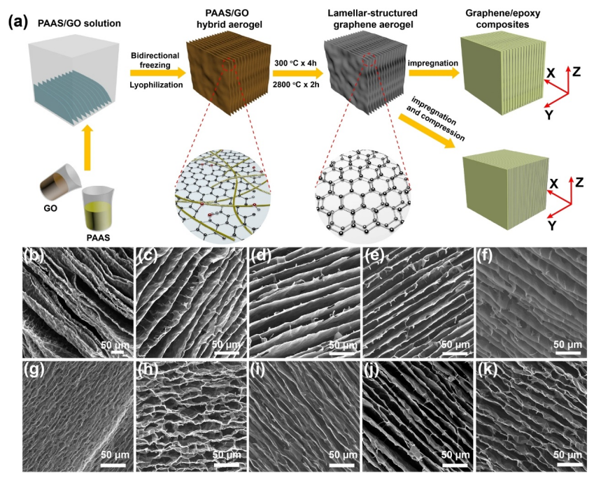 盡管導(dǎo)熱石墨烯片在提高聚合物的面內(nèi)熱導(dǎo)率方面是有效的,但由此產(chǎn)生的納米復(fù)合材料通常表現(xiàn)出低的面內(nèi)熱導(dǎo)率,限制了它們作為熱界面材料的應(yīng)用。在此,層狀結(jié)構(gòu)的聚酰胺酸鹽/氧化石墨烯 (PAAS/GO) 混合氣凝膠是通過 PAAS/GO 懸浮液的雙向冷凍然后凍干來構(gòu)建的。隨后,PAAS 單體聚合成聚酰亞胺 (PI),而 GO 在 300℃ 的熱退火過程中轉(zhuǎn)化為熱還原氧化石墨烯 (RGO)。在 2800 ℃的最終石墨化將 PI 轉(zhuǎn)化為具有 RGO 感應(yīng)效應(yīng)的石墨化碳,同時(shí),RGO 被熱還原并修復(fù)為高質(zhì)量的石墨烯。最后,首次制備出具有優(yōu)異平面熱傳導(dǎo)能力的層狀結(jié)構(gòu)石墨烯氣凝膠,其優(yōu)異的平面熱傳導(dǎo)能力源于其垂直排列和緊密堆疊的高質(zhì)量石墨烯薄片。在用環(huán)氧樹脂進(jìn)行真空輔助浸漬后,所得的含有 2.30 vol% 石墨烯的環(huán)氧樹脂復(fù)合材料表現(xiàn)出高達(dá) 20.0 W m