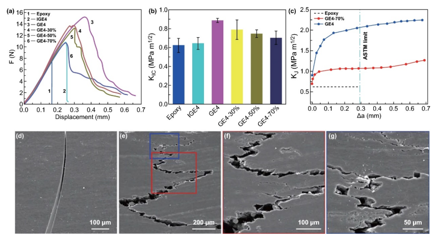 Figure 6. (a)環(huán)氧樹脂、IGE4、GE4、GE4-30%、GE4-50% 和 GE4-70% 的典型力-位移曲線。(b)環(huán)氧樹脂和我們的石墨烯/環(huán)氧樹脂復(fù)合材料的K IC比較。(c)最大斷裂韌性與裂紋長度的 R 上升曲線。(d) SEM 圖像顯示了直線裂紋擴(kuò)展。(e-g) SEM 圖像顯示 GE4-70% 的曲折裂紋擴(kuò)展;(f)和(g)是(e)中所選部分的放大版本。