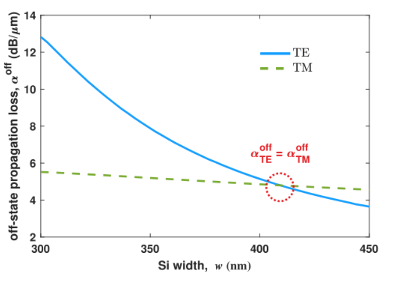 圖 2. 非狀態(tài)傳播損耗與硅波導(dǎo)寬度的關(guān)系。 在 w = 410 nm 處獲得偏振不敏感損耗。