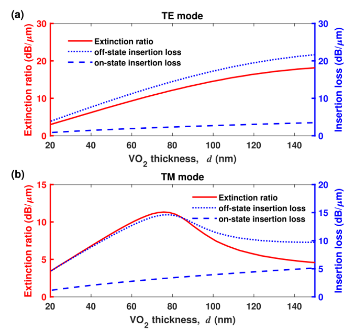 圖 4. (a) TE 和 (b) TM 模式下調(diào)制器的斷態(tài)和通態(tài)插入損耗和相應(yīng)的消光比。