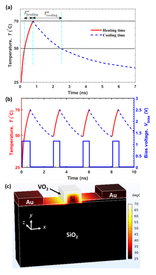 2 在絕緣相和金屬相之間的相變是通過施加幅度為 1.12V、寬度為 0.53ns(第一個(gè)脈沖除外)和周期為 2.57ns 的納秒電脈沖來完成的。 (c) 加熱時(shí)間結(jié)束時(shí)器件空間溫度分布的 3D 視圖。