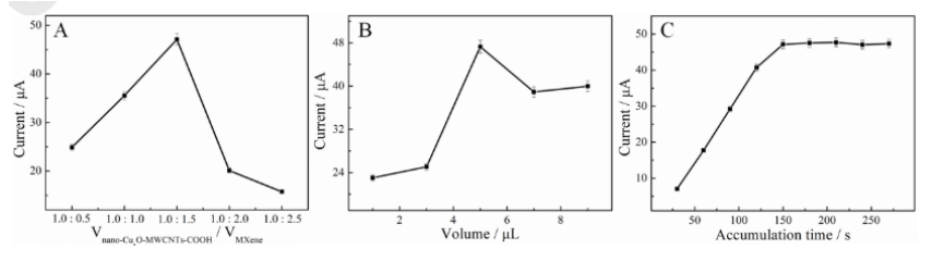 圖5 (A) nano-CuxOMWCNTs-COOH與MXene組成比例的影響。(B) nano-CuxOMWCNTs-COOH/MXene在GCE上的包覆量。(C) DPV對10.0 μM BN氧化峰電流的累積時(shí)間。