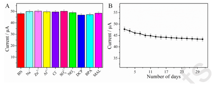 圖9 (A)各種干擾下對BN檢測的影響。(B) nano-CuxO-MWCNTs-COOH/MXene/GCE的穩(wěn)定性。