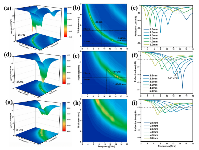 圖8. 三維和二維反射損失圖以及不同厚度的反射損失圖。